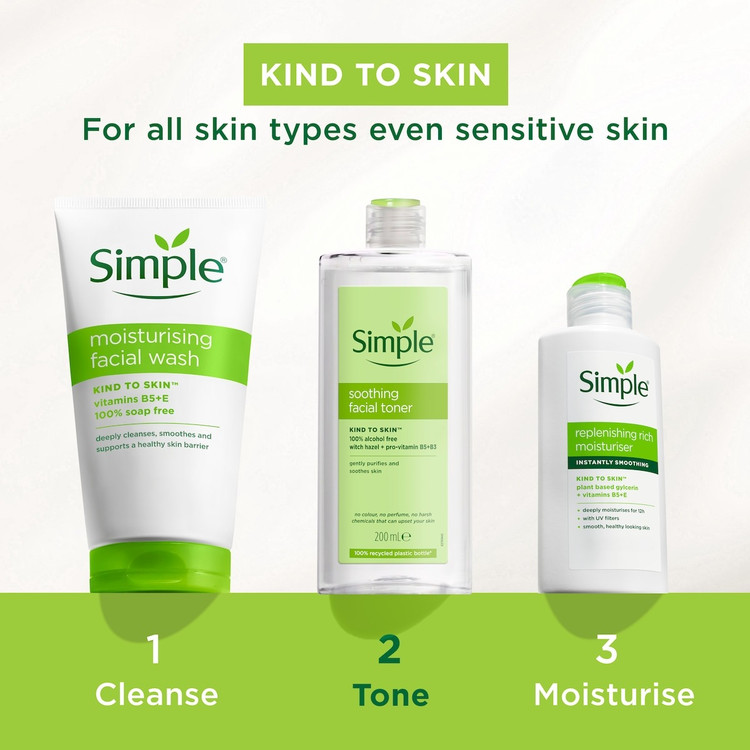 تونر سیمپل مدل kind to skin حاوی آلانتوئین، عصاره فندوق افسونگر و ویتامین B5 است. استفاده از تونر سیمپل برای همه پوست ها حتی پوست های حساس نیز مناسب است. این تونر می تواند علاوه بر کمکی که به تنظیم pH پوست شما میکند، برای آبرسانی پوست شما نیز بسیار مفید بوده و به تسکین پوست شما نیز سرعت میبخشد. این تونر یک محصول عالی برای کمک به سلامت پوست و پاکسازی آن می باشد که به دلیل عدم استفاده از ترکیبات شیمیایی مختلف مانند الکل و پارابن، برای پوست های حساس نیز مفید است.