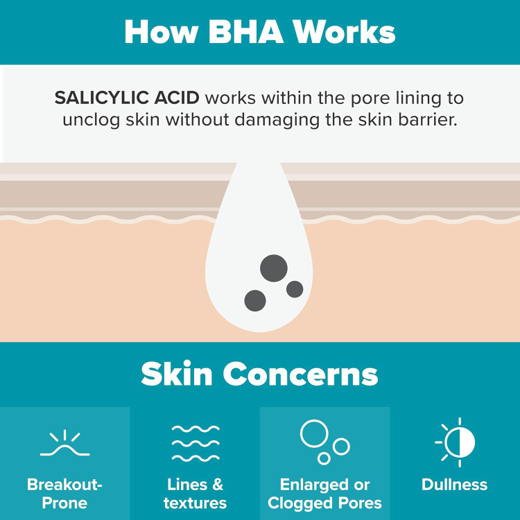 در فرمولاسیون این محصول از سالیسیلیک اسید استفاده شده که یک بتا هیدروکسی اسید یا BHA است. این اسید با لایهبرداری طبیعی و حذف لایههای اضافی پوست سبب پاکسازی و کاهش منافذ باز می شود. همچنین پوست را نرم کرده و خطوط ریز و چروک ها را به وضوح کاهش می دهد.