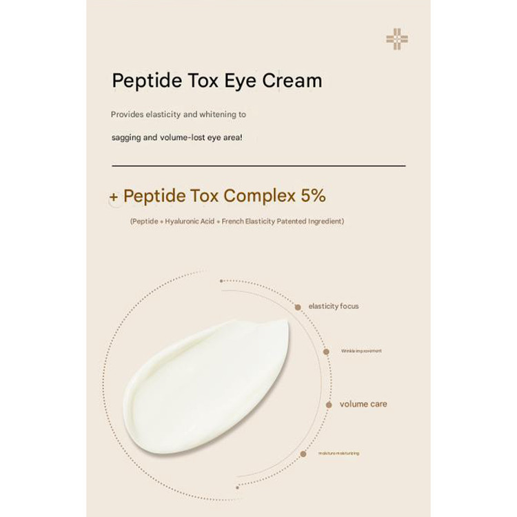 - کمپلکس پپتید-توکس 5%: این کمپلکس حاوی انواع مختلف پپتیدها است که نقش اساسی در تحریک تولید کلاژن و الاستین دارند. افزایش این پروتئینهای ساختاری به بهبود خاصیت ارتجاعی پوست، کاهش عمق خطوط ریز و چین و چروک و افزایش استحکام پوست دور چشم کمک میکند. استیل هگزاپپتید-8 موجود در این ترکیب، با عملکردی مشابه بوتاکس، به شل شدن عضلات ناحیه دور چشم و کاهش چروکهای ناشی از حرکات صورت کمک میکند.