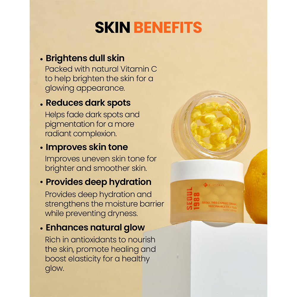 کرم کپسولی یوجا و نیاسینامید سئول 1988 یک محصول پیشرفته از برند کی سکرت است که با ترکیب 5% نیاسینامید و عصاره یوجا، برای روشنکنندگی، آبرسانی و بهبود رنگ پوست طراحی شده است.