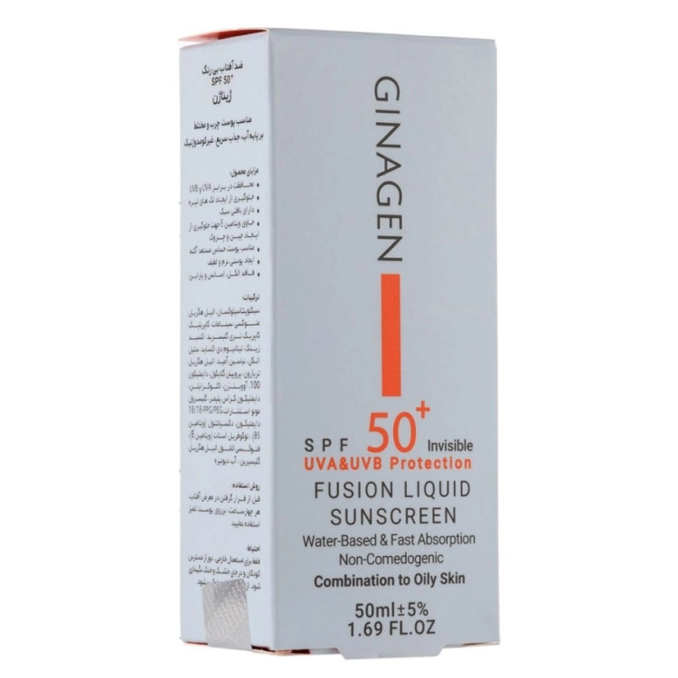 ضد آفتاب ژیناژن، فاقد عطر، رنگ و فاقد الکل است. ضد آفتاب فیوژن لیکوئید ژیناژن مناسب پوست های چرب و مختلط بوده و به سرعت جذب پوست می شود.